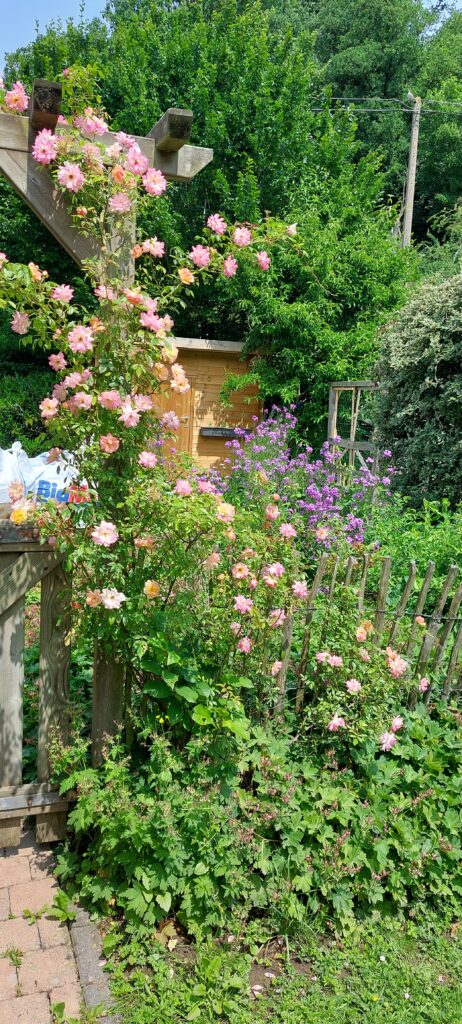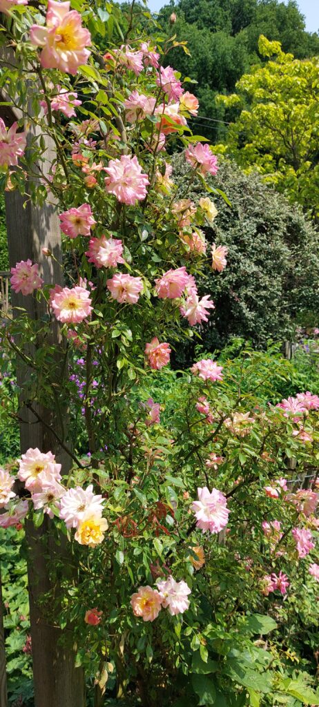Un rosier grimpant à petit développement, parfait pour une clôture ou comme ici s’adosser à un encadrement de passage. Les branches sont fines et faciles à conduire. Légèrement parfumé et peu épineux, je l’aime aussi pour son joli panaché : rose, orangé, jaune. Les fleurs fofolles s’ébouriffent avec le temps, ça lui donne un côté « arti ».